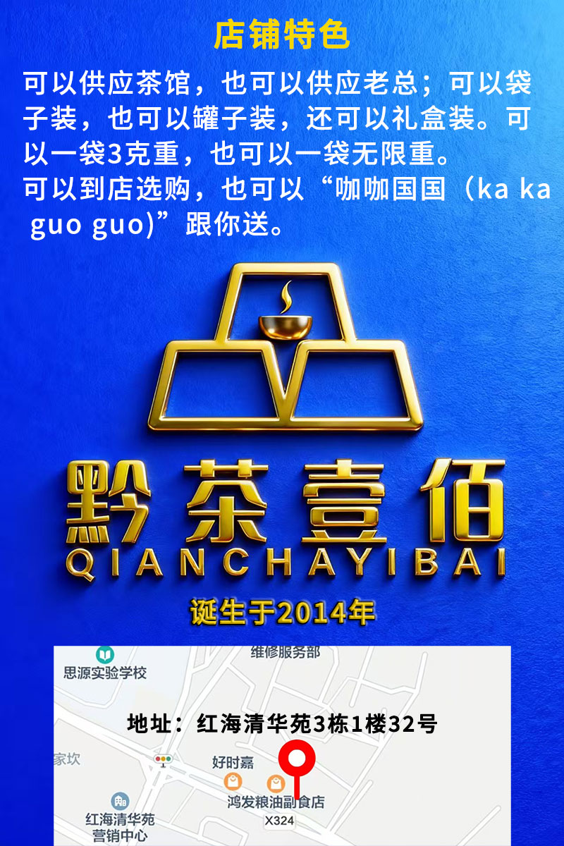 店铺特色:可以供应茶馆,也可以供应老总;可以袋子装,也可以罐子装,还可以礼盒装。可以一袋3克重,也可以一袋无限重。想喝贵州本地茶叶,可以到店选购,也可以“咔咔角角(ka ka guo guo)”跟你送。